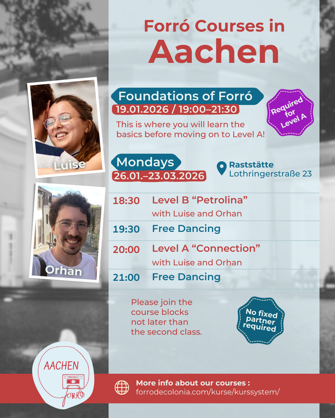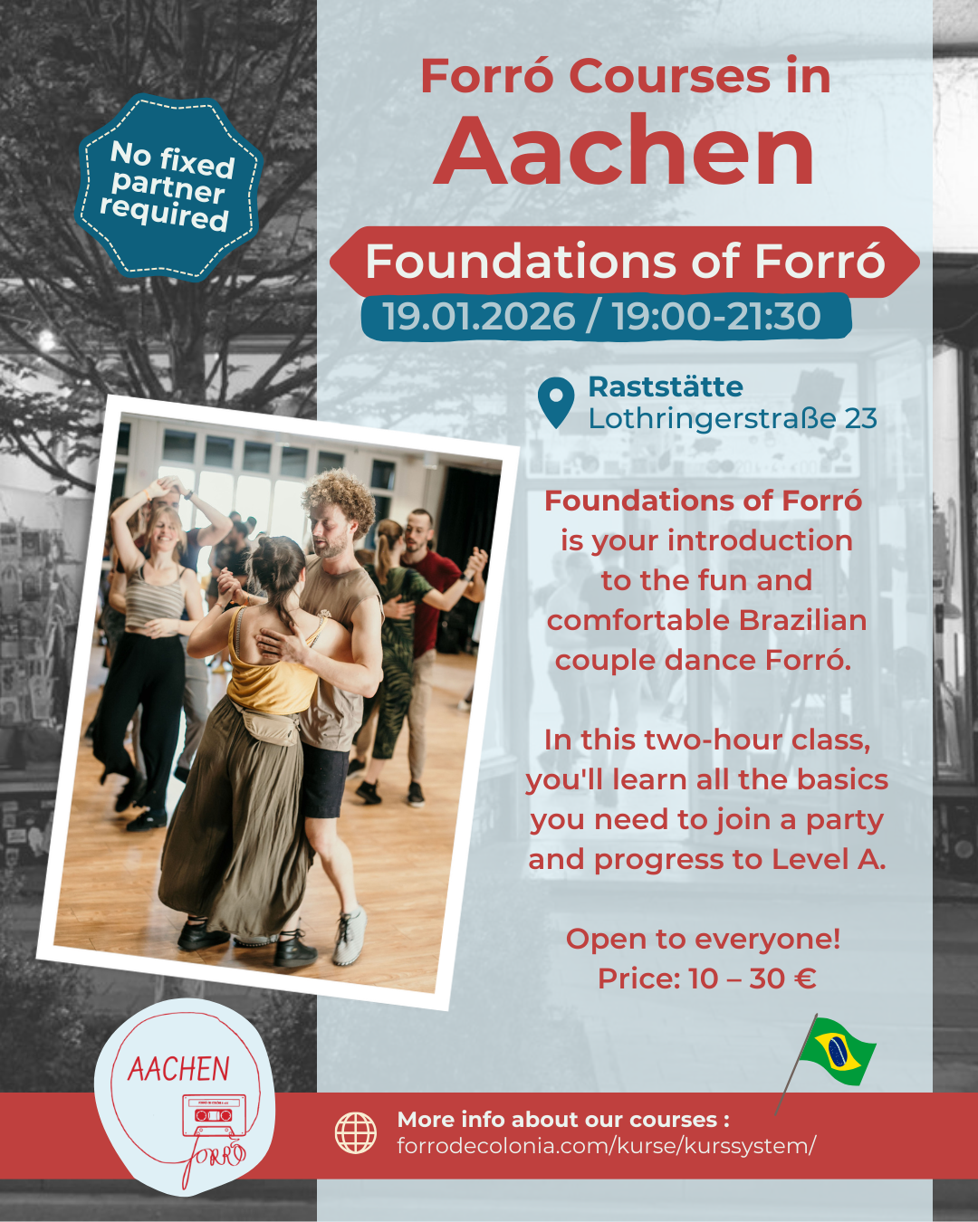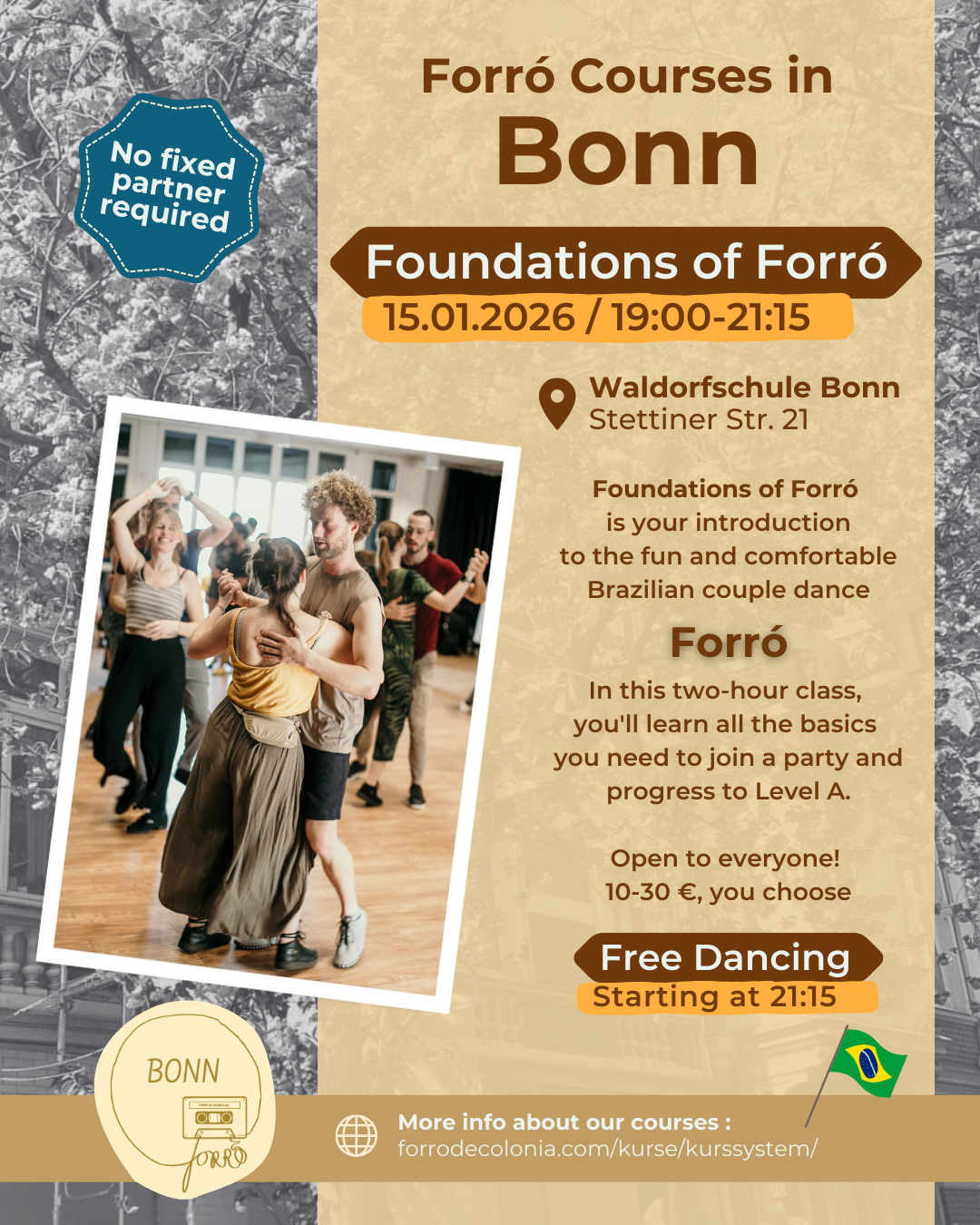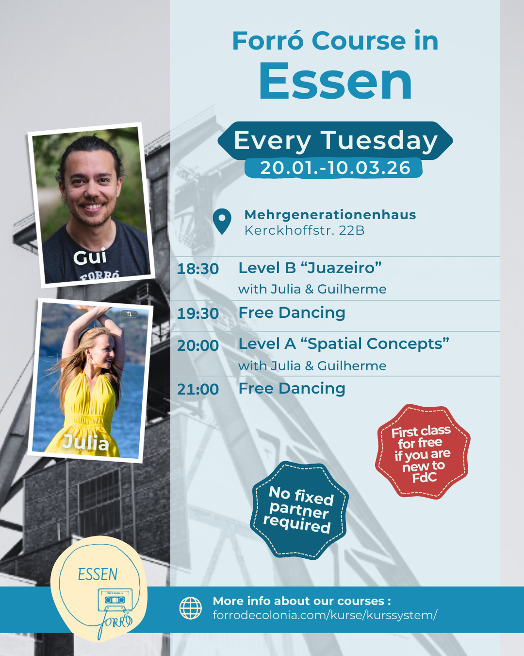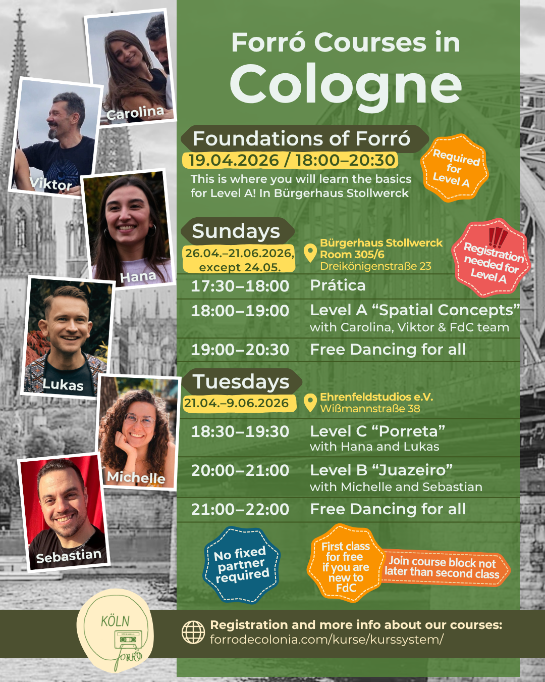 Schön, dass ihr bei unseren Forró-Kursen mitmachen wollt! Schaut euch hier unser Kurssystem an, hier findet ihr unsere Preise, und weiter unten gibt es alle Uhrzeiten und Addressen für die Kurse in den FdC-Standorten.